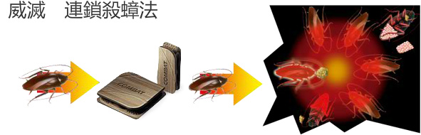 | 利用蟑螂分食同伴屍體及糞便習性,將藥劑傳播給其他蟑螂,數日後連鎖殺死整窩的 蟑螂及其卵鞘。 |